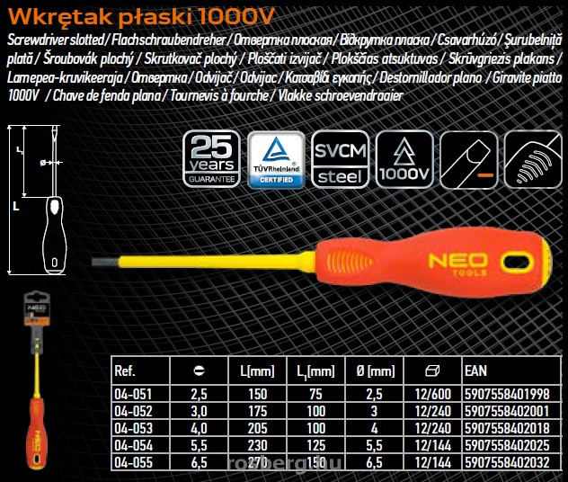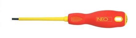 NEO 1000 V lapos csavarhúzó. A szerszám max. 1000 V feszültség alatti használatra minősített. A csavarhúzó szára kivételesen ellenálló SVCM acélból készül. A csavarhúzó hegy hőkezelésnek lett alávetve, így megfelelő, 56 HRC keménységet és hajlítószilárdságot ért el. A csavarhúzó hegye mágneses. A markolat három élű hasáb alakja a kialakított hüvelyktámasszal csökkenti a kéz megterhelését munka közben, és megkönnyíti a megfelelő forgatónyomaték elérését. A bimateriál markolat nem csúszik ki a kézből, ellenálló vegyszerek, kenőolajok és zsírok hatásának. A szerszám minőségét bizonyítja a TÜV tanúsítvány és a gyártó által nyújtott 25 éves jótállás. A NEO márka a professzionális igényeket is kielégíti.