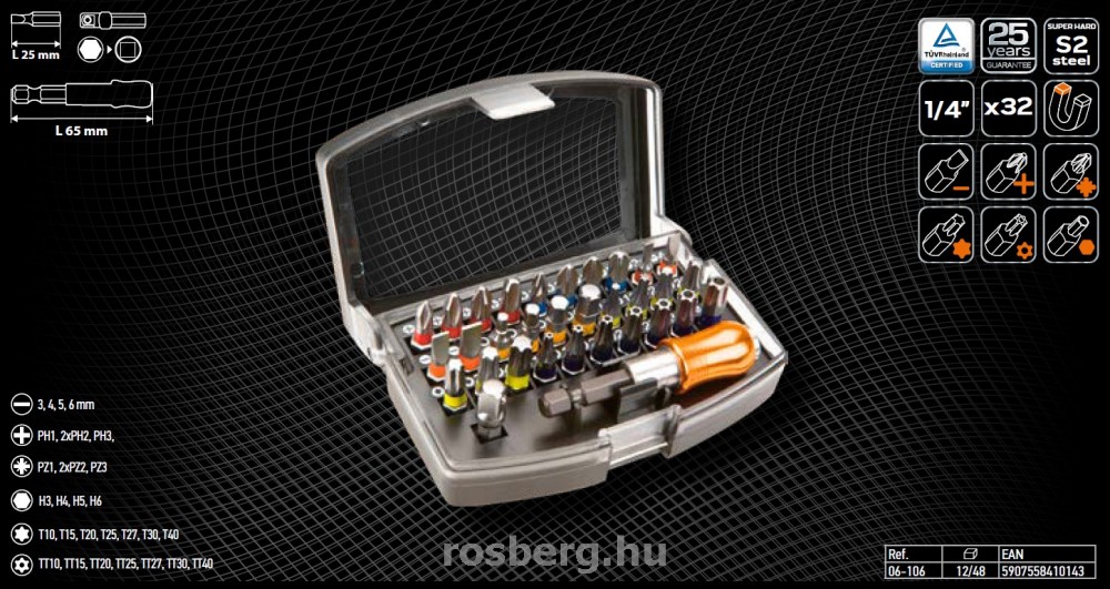 NEO ¼"-os, 32 elemes csavarhúzó bit készlet. Az alkalmazott S2 acélötvözetnek köszönhetően a hegyek keménysége eléri a 60 HRC értéket, ami jelentősen megnöveli élettartamukat és a velük végzett munka minőségét. A készlet 25 mm hosszú lapos, kereszt, imbusz, Torx, furatos Torx bitek bő választékát tartalmazza. A bitek mágneses heggyel rendelkeznek. A készletet bit befogó és dugóadapter egészíti ki. A termék kiváló minőségét és megbízhatóságát bizonyítja a TÜV Rheinland tanúsítvány. A NEO márka a professzionális igényeket is kielégíti.