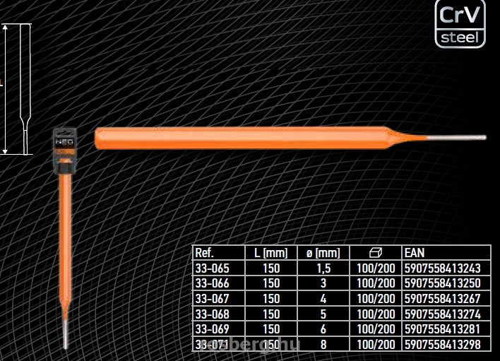 NEO hatszög keresztmetszetű kiütő, 150 mm hosszú. Furatok tartalmának, pl. csapszegeknek a kiütésre szolgál Vége kör keresztmetszetű. Kiváló minőségű, a terméknek hosszú élettartamot biztosító króm-vanádium acélból készül. A NEO márka a professzionális igényeket is kielégíti.