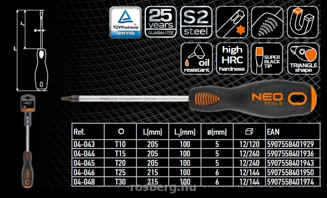 NEO Torx csavarhúzó. A csavarhúzó szára kivételesen ellenálló S2. A csavarhúzó hegy hőkezelésnek lett alávetve, így megfelelő, 56 HRC keménységet és hajlítószilárdságot ért el. A csavarhúzó hegye mágneses. A markolat három élű hasáb alakja a kialakított hüvelyktámasszal csökkenti a kéz megterhelését munka közben, és megkönnyíti a megfelelő forgatónyomaték elérését. A bimateriál markolat nem csúszik ki a kézből, ellenálló vegyszerek, kenőolajok és zsírok hatásának. A szerszám minőségét bizonyítja a TÜV tanúsítvány és a gyártó által nyújtott 25 éves jótállás. A NEO márka a professzionális igényeket is kielégíti.