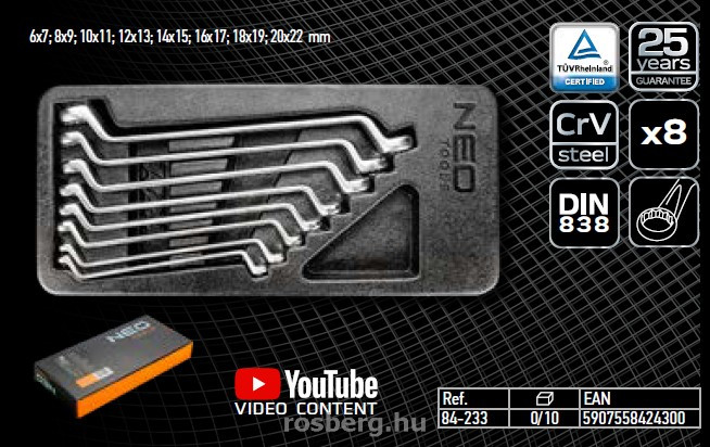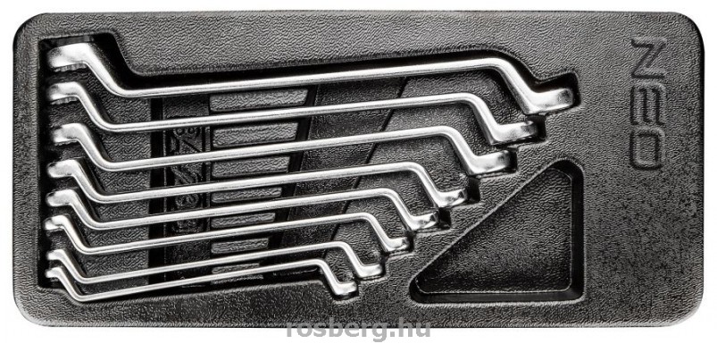 NEO Csillag kulcs készlet, hajlított (Ref.sz. 84-233) 8 db normális méretű kulcsot tartalmaz (6 - 22 mm), a DIN 838 szabvány szerint készült. A kimagasló minőségű króm-vanádium acél biztosítja a kulcsok sokéves tartósságát. A szerszámok praktikus, a NEO 84-221 és 84-222 szerszámos szekrények fiókjaiba illő műanyag bőröndben leszállítva. A termék megbízhatóságát a 25 éves garancia igazolja. A NEO márka a professzionális igényeket is kielégíti.