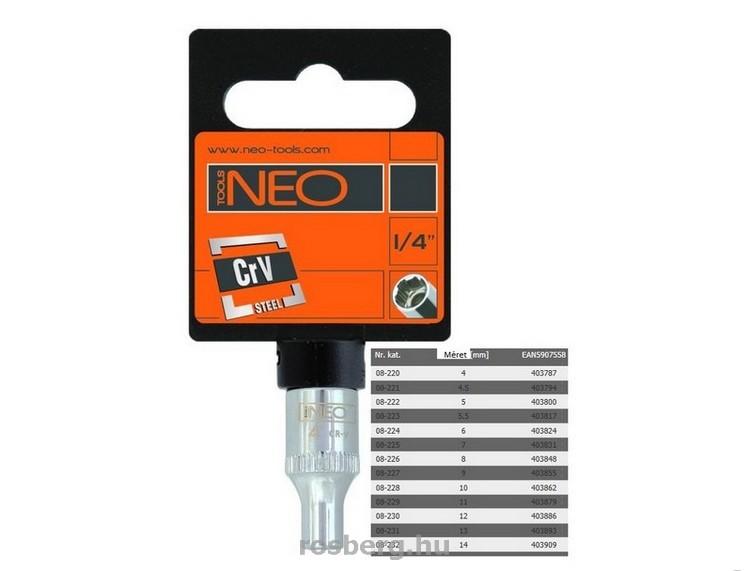 A NEO ¼”-os hatlapú dugókulcs króm-vanádium acélból készül, a DIN 3124 szabványnak megfelelően. A Superlock "laprafogó" technológiás dugókulcs lehetővé teszi a sérült sarkú csavarok kicsavarását is, valamint védi a csavarokat a deformálódástól. A szerszám minőségét bizonyítja a TÜV tanúsítvány és a 25 éves gyártói garancia.
