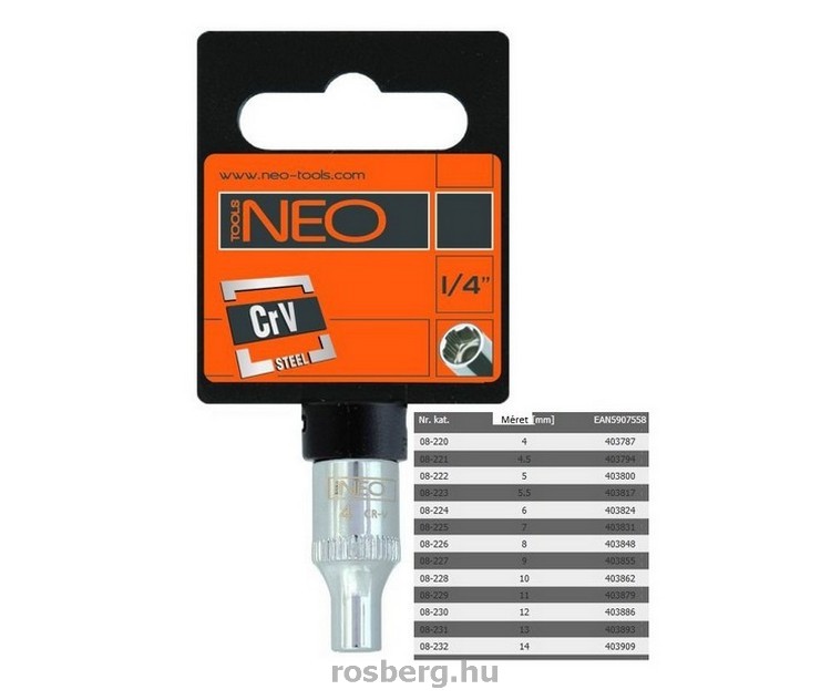 A NEO ¼”-os hatlapú dugókulcs króm-vanádium acélból készül, a DIN 3124 szabványnak megfelelően. A Superlock "laprafogó" technológiás dugókulcs lehetővé teszi a sérült sarkú csavarok kicsavarását is, valamint védi a csavarokat a deformálódástól. A szerszám minőségét bizonyítja a TÜV tanúsítvány és a 25 éves gyártói garancia.