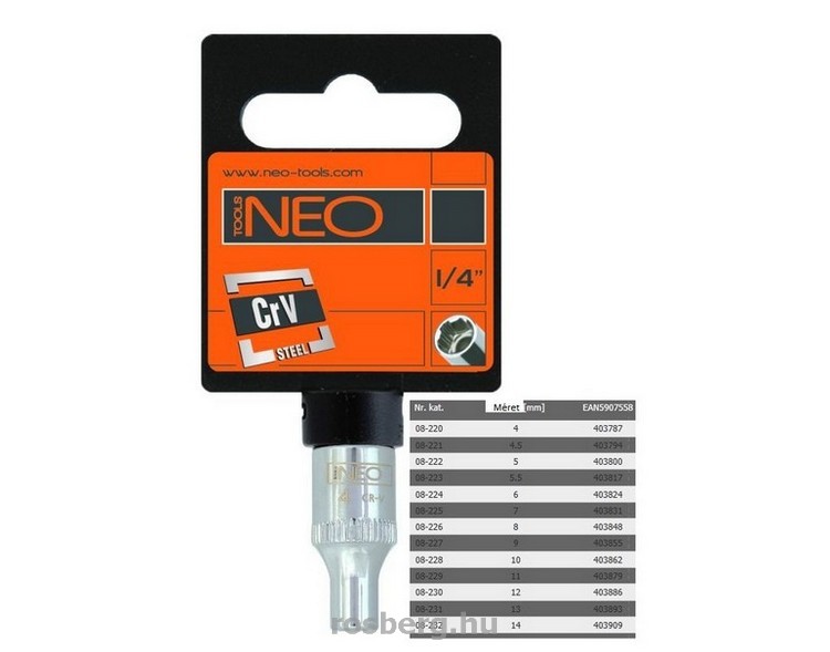 A NEO ¼”-os hatlapú dugókulcs króm-vanádium acélból készül, a DIN 3124 szabványnak megfelelően. A Superlock "laprafogó" technológiás dugókulcs lehetővé teszi a sérült sarkú csavarok kicsavarását is, valamint védi a csavarokat a deformálódástól. A szerszám minőségét bizonyítja a TÜV tanúsítvány és a 25 éves gyártói garancia.