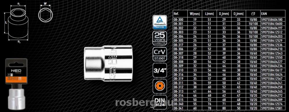 A NEO ¾"-os 12 pontos dugókulcs króm-vanádium acélból készül, a DIN 3124 szabványnak megfelelően. A szerszám minőségét bizonyítja a TÜV tanúsítvány és a gyártó által nyújtott 25 éves jótállás. A NEO márka a professzionális igényeket is kielégíti.