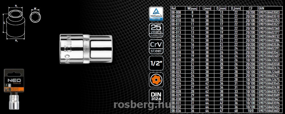 A NEO ½”-os hatlapú dugókulcs króm-vanádium acélból készül, a DIN 3124 szabványnak megfelelően. A Superlock technológiás dugókulcs lehetővé teszi a sérült csavarok kicsavarását is, valamint védi a csavarokat a deformálódástól. A szerszám minőségét bizonyítja a TÜV tanúsítvány és a gyártó által nyújtott 25 éves jótállás. A NEO márka a professzionális igényeket is kielégíti.