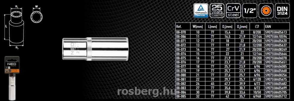 A NEO ½"-os tizenkétlapú dugókulcs króm-vanádium acélból készül, a DIN 3124 szabványnak megfelelően. A szerszám minőségét bizonyítja a TÜV tanúsítvány és a gyártó által nyújtott 25 éves jótállás. A NEO márka a professzionális igényeket is kielégíti.