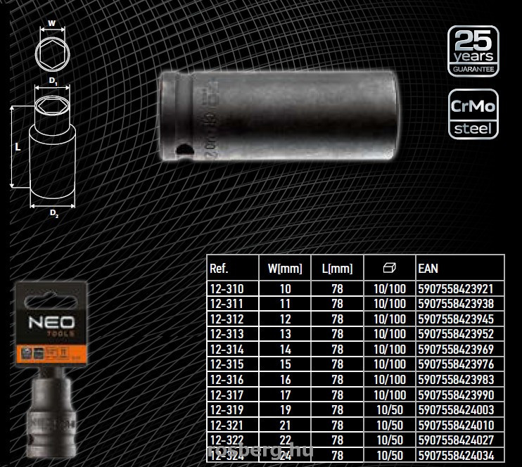 NEO dugókulcs 19 mm cr-mo, pneumatikus géphez, hosszú 12-319