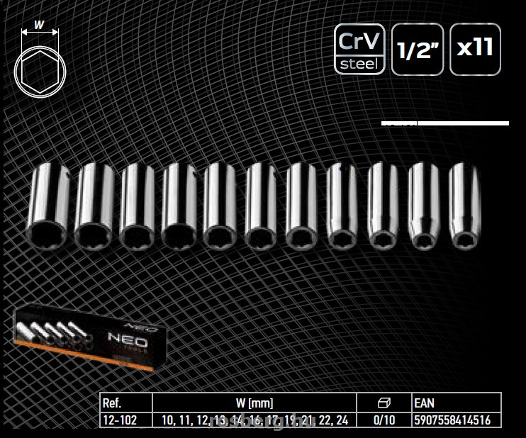 NEO ½"-os, 11 elemes gépi dugókulcs készlet. Hatlapú gépi dugókulcsokat tartalmaz a népszerű, 10-24 mm közötti méretekben. A hosszú dugókulcsok használhatók a mély fészekben elhelyezkedő csavarokhoz is. Nagy ellenállóképességű króm-vanádium acélból készültek. Meghosszabbított élettartamú dugókulcsok a forró kovácsolási technológiának köszönhetően. Praktikus, tárolásra szolgáló fémkazettába csomagolva. A NEO márka a professzionális igényeket is kielégíti.
