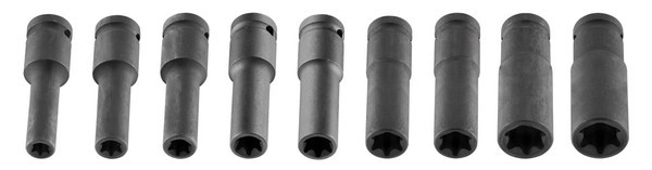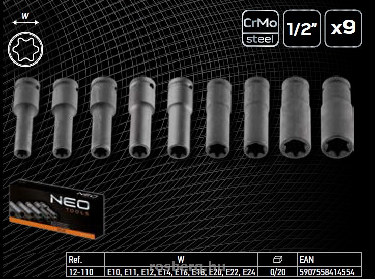 NEO ½"-os, 9 elemes gépi dugókulcs készlet. Torx gépi dugókulcsokat tartalmaz a népszerű, E10-E24 mm közötti méretekben. A hosszú dugókulcsok használhatók a mély fészekben elhelyezkedő csavarokhoz is. Igen szilárd króm-molibdén acélból készülnek. Meghosszabbított élettartamú dugókulcsok a forró kovácsolási technológiának köszönhetően. Praktikus, tárolásra szolgáló műanyag kazettába csomagolva. A NEO márka a professzionális igényeket is kielégíti.