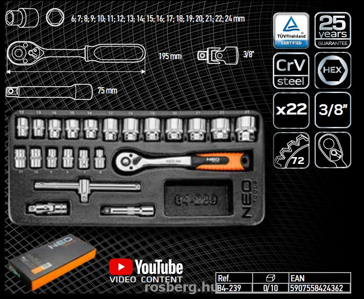 3/8" dugókulcs készlet (ref. szám 84-239), 22 darabos, kimagasló minőségű króm-vanádium acélból kivitelezve. A készlet részét képezi a (72 fogas) retesz mechanikájú racsni hajtókar. A készlet hatlapos dugókulcsok gazdag csomagját tartalmazza (6 - 24 mm méretekben). A készletet kényelmes hosszabítók, hajtókar és csukló egészítik ki. A szerszámok méreteikkel a NEO 84-221 és 84-222 szerszámos szekrények fiókjaiba illő műanyag bőröndben leszállítva. A termék megbízhatóságát a 25 éves garancia igazolja. A NEO márka a professzionális igényeket is kielégíti.