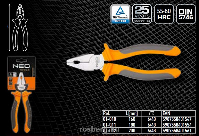 A NEO kombinált fogók a DIN 5746 szabványnak megfelelően készülnek A kiváló minőségű, indukciósan edzett (55-60 HRC) acél pofák biztosítják a munkadarab biztos fogását, kemény huzalok hatékony vágását és alakítását. Az ergonómikus bimateriál markolat növeli a használat komfortját. A szerszám minőségét bizonyítja a TÜV tanúsítvány és a gyártó által nyújtott 25 éves jótállás. A NEO márka a professzionális igényeket is kielégíti.