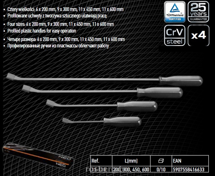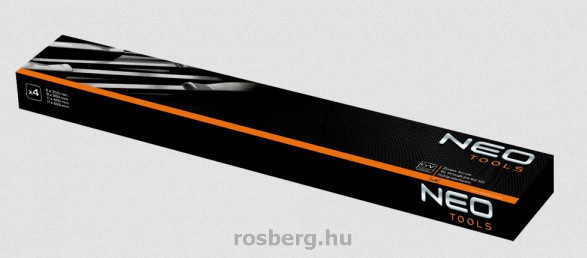 NEO feszítővas készlet. A készletben 4 db feszítővas van, méreteik: 6 x 200 mm, 9 x 300 mm, 11 x 450 mm és 11 x 600 mm. Nagy szilárdságú, hosszú élettartamot biztosító króm-vanádium acélból készülnek. Ergonómikus markolatuk növeli használatuk kényelmét. A termék kiváló minőségét és megbízhatóságát bizonyítja a TÜV Rheinland tanúsítvány. A NEO márka a professzionális igényeket is kielégíti.