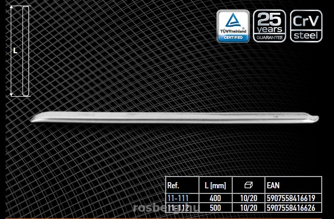 A NEO gumiabroncs szerelővas nagy szilárdságú króm-vanádium acélból készül. Egyik végén horgos, másik végén kanalas kivitel. A termék kiváló minőségét és megbízhatóságát bizonyítja a TÜV Rheinland tanúsítvány. A NEO márka a professzionális igényeket is kielégíti.