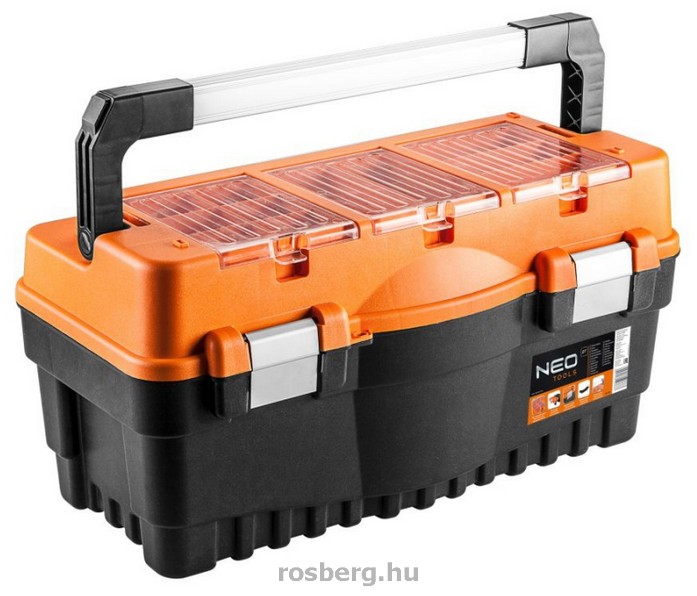 NEO szerszámosláda 21" (kat. sz. 84-105), mérete 54.7 x 27.1 x 27.8 cm. Szolid, praktikus szerszámosláda strapabíró műanyagból, alumínium csatokkal. A szerszámosláda el van látva két rendeződobozzal az apró elemek tárolásához, szétnyitható belső tálcával és kényelmes alumínium hordfogantyúval. A NEO márka a professzionális igényeket is kielégíti.