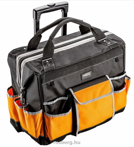 A NEO kerekes szerszámostáska (kat.sz.: 84-302) hosszú élettartamot garantáló 600D poliamid szövetből készül. Merevített felépítéső, megerősített varratokkal és cipzárakkal. A reteszelhető teleszkóppal, a megerősített kerekeivel megkönnyíti a nehéz tartalom szállítását. A táska erős, szegecsekkel megerősített hordfogantyúval van felszerelve. A 11 belső és a 6 külső zsb, valamint a tágas fő rekesz sok szerszám tárolását és szállítását teszi lehetővé. A NEO márka a professzionális igényeket is kielégíti.