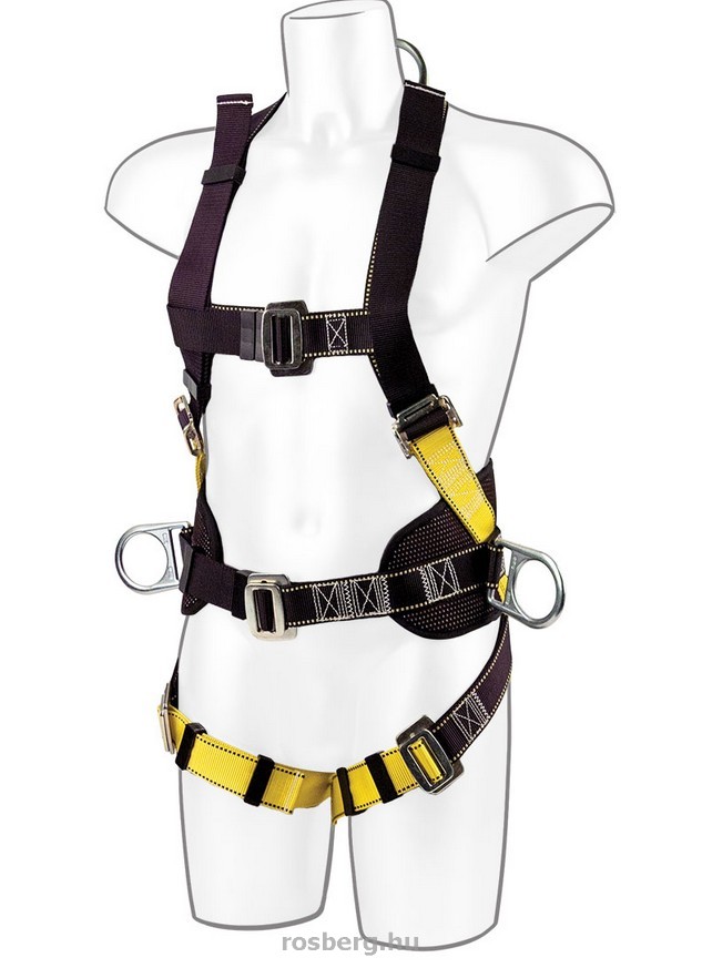 Új teljes testhevederzet, mely egyedi lélegző párnázattal, automata gyorscsatokkal rendelkezik. Könnyen és gyorsan rögzíthető, beállítható. D-gyűrűkkel ellátva. 2 ponton rögzíthető, két oldalsó D gyűrű (1) és hátsó D gyűrű (2).