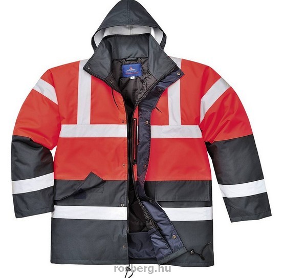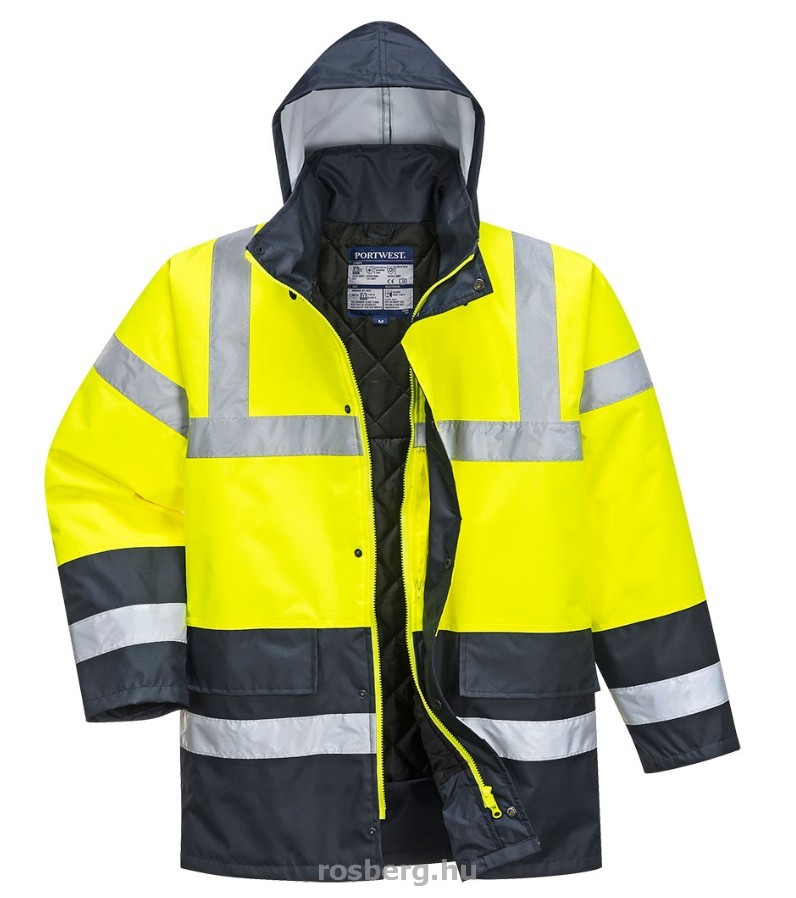 Leírás: Kedvelt kontraszt színösszeállítású jól láthatósági kabát. Melegen és szárazon tart minden időjárási helyzetben. Teljesen vízálló, rejtett kapucnival, kötött mandzsettával, kétirányú zippzárral készül.