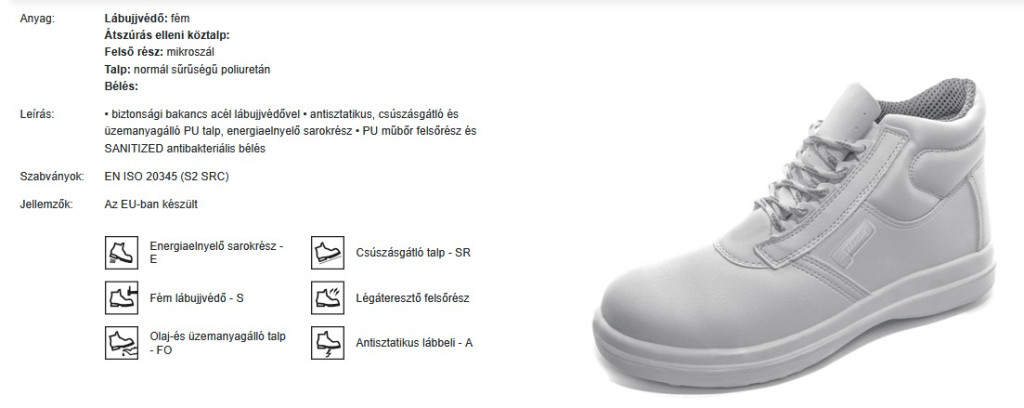 • biztonsági bakancs acél lábujjvédővel • antisztatikus, csúszásgátló és üzemanyagálló PU talp, energiaelnyelő sarokrész • PU műbőr felsőrész és SANITIZED antibakteriális bélés