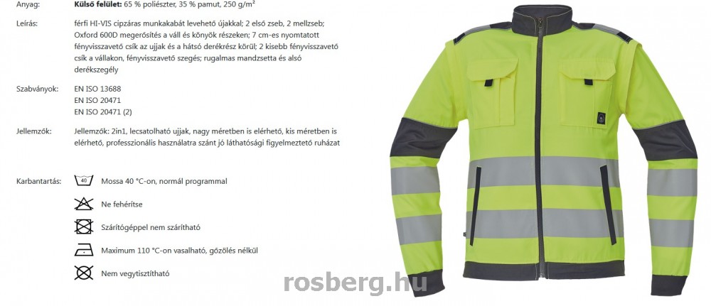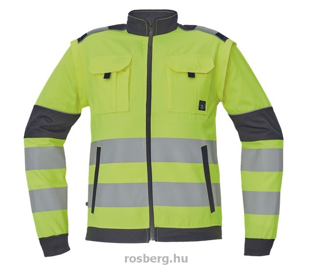 férfi HI-VIS cipzáras munkakabát levehető újakkal; 2 első zseb, 2 mellzseb; Oxford 600D megerősítés a váll és könyök részeken; 7 cm-es nyomtatott fényvisszavető csík az ujjak és a hátsó derékrész körül; 2 kisebb fényvisszavető csík a vállakon, fényvisszavető szegés; rugalmas mandzsetta és alsó derékszegély