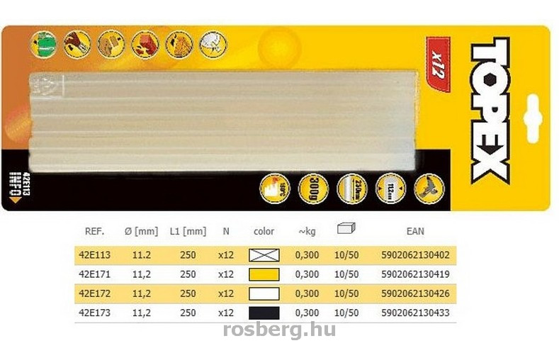 TOPEX 11,2 mm átmérőjű, 250 mm hosszú ragasztórúd. 12 darabos csomagolás. Tökéletesen beválik a barkácsműhelyben és a profi alkalmazásokban is, pl. padlószőnyegek fektetésében, bútorok készítésében. A TOPEX márka ezermestereknek készül.